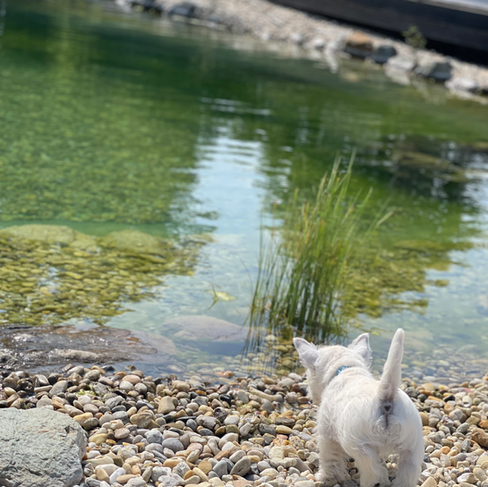 V naši vzreji imamo tudi plavalni ribnik, ki psom omogoča dodatno obliko gibanja in sprostitve. Plavanje je odličen način za trening, ki je hkrati tudi varen za njihove sklepe. Številni zahodnovišavski beli terierji uživajo v vodi, kar pripomore k dodatni stimulaciji in jim omogoča sproščeno igro. To ni le fizična aktivnost, ampak tudi priložnost za krepitev njihove samozavesti, saj so izpostavljeni različnim situacijam in okoljem, kar jih naredi bolj samozavestne in prilagodljive.